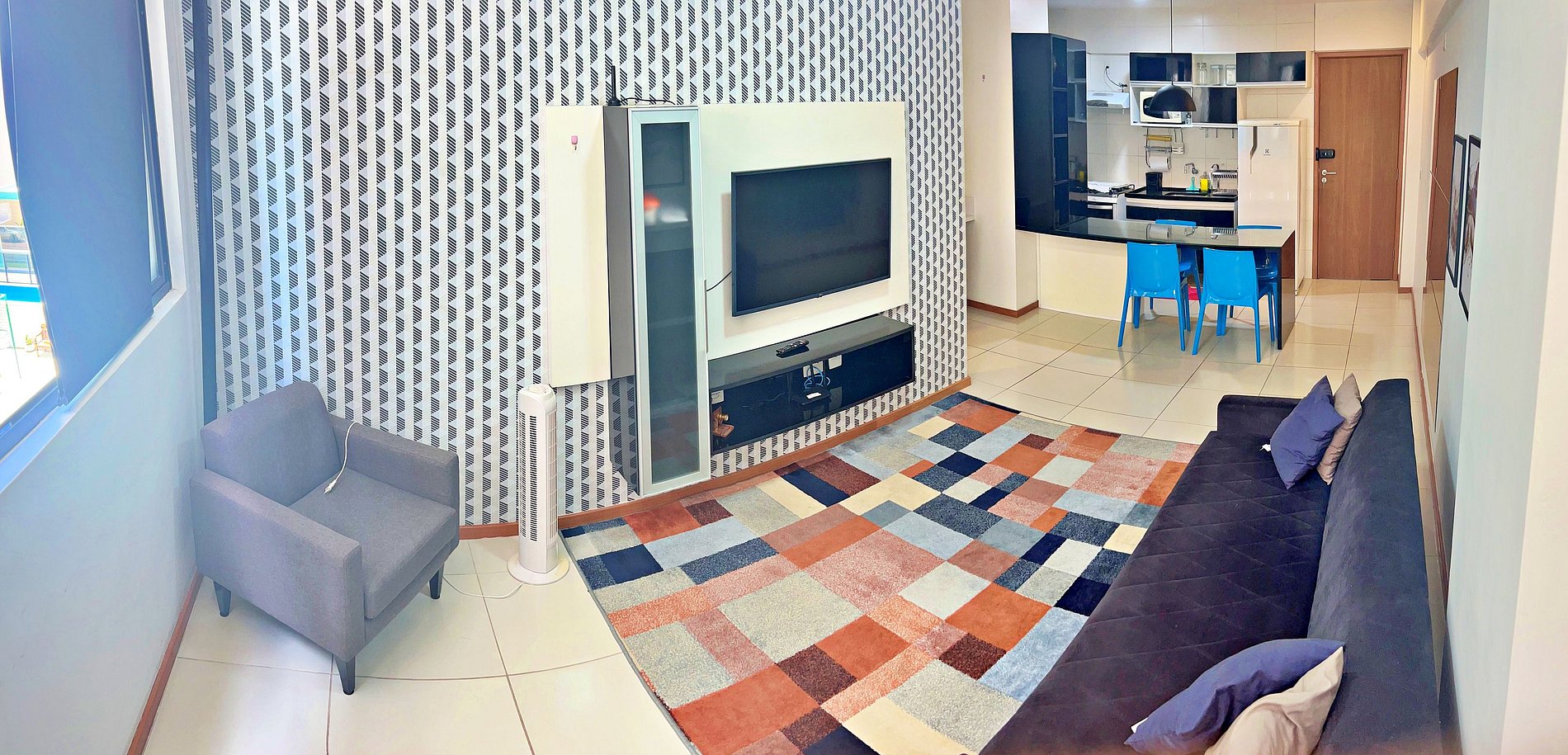 | SALA DE ESTAR | com sofá, ventilador, tapete e rack. Smart TV conectada na internet com canais local e online. Mesa de jantar com assento para 4 lugares.