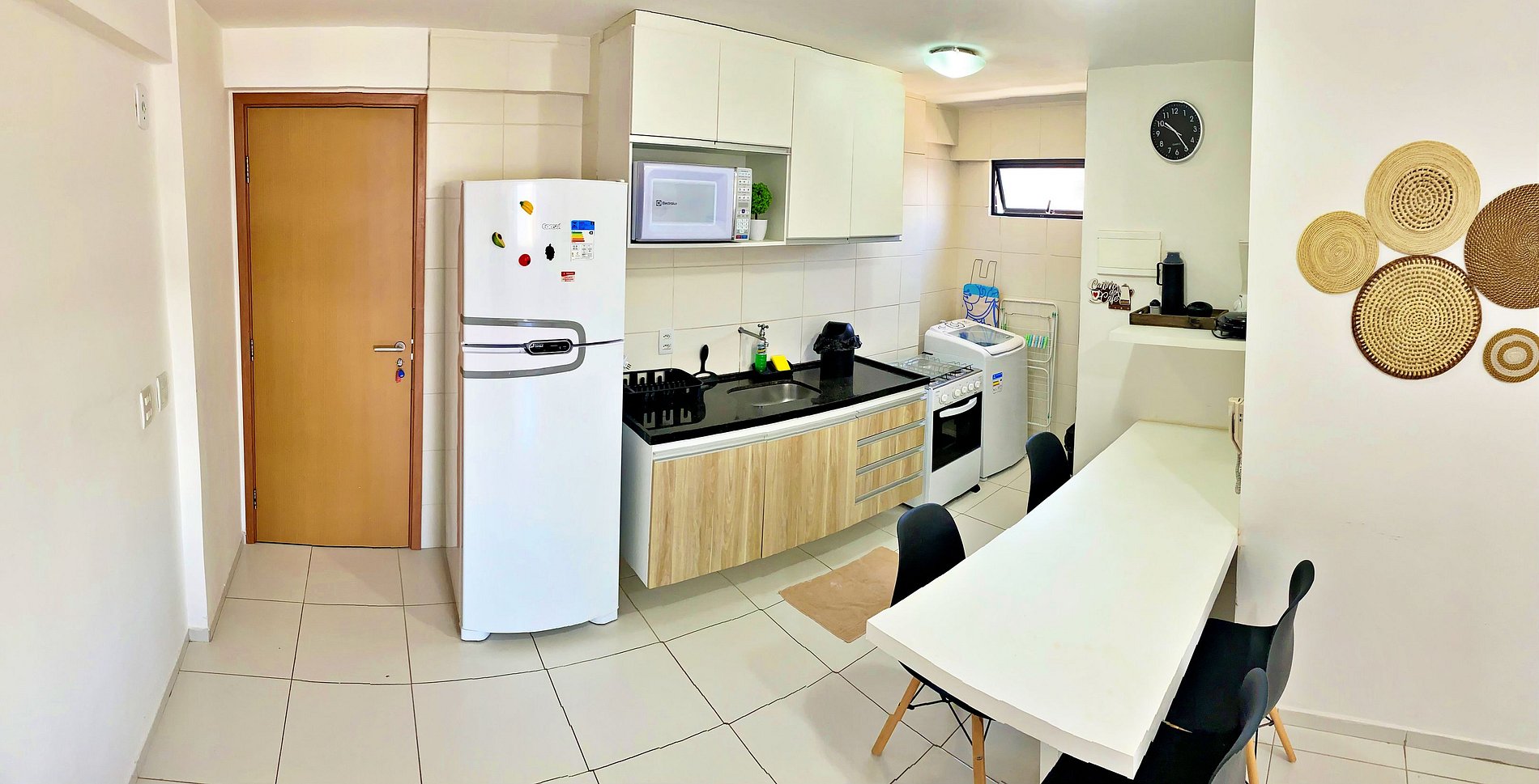 | COZINHA | com geladeira, fogão e micro-ondas, máquina de lavar, liquidificador, sanduicheira, jogo de panelas e armários com utensílios para preparar refeições.