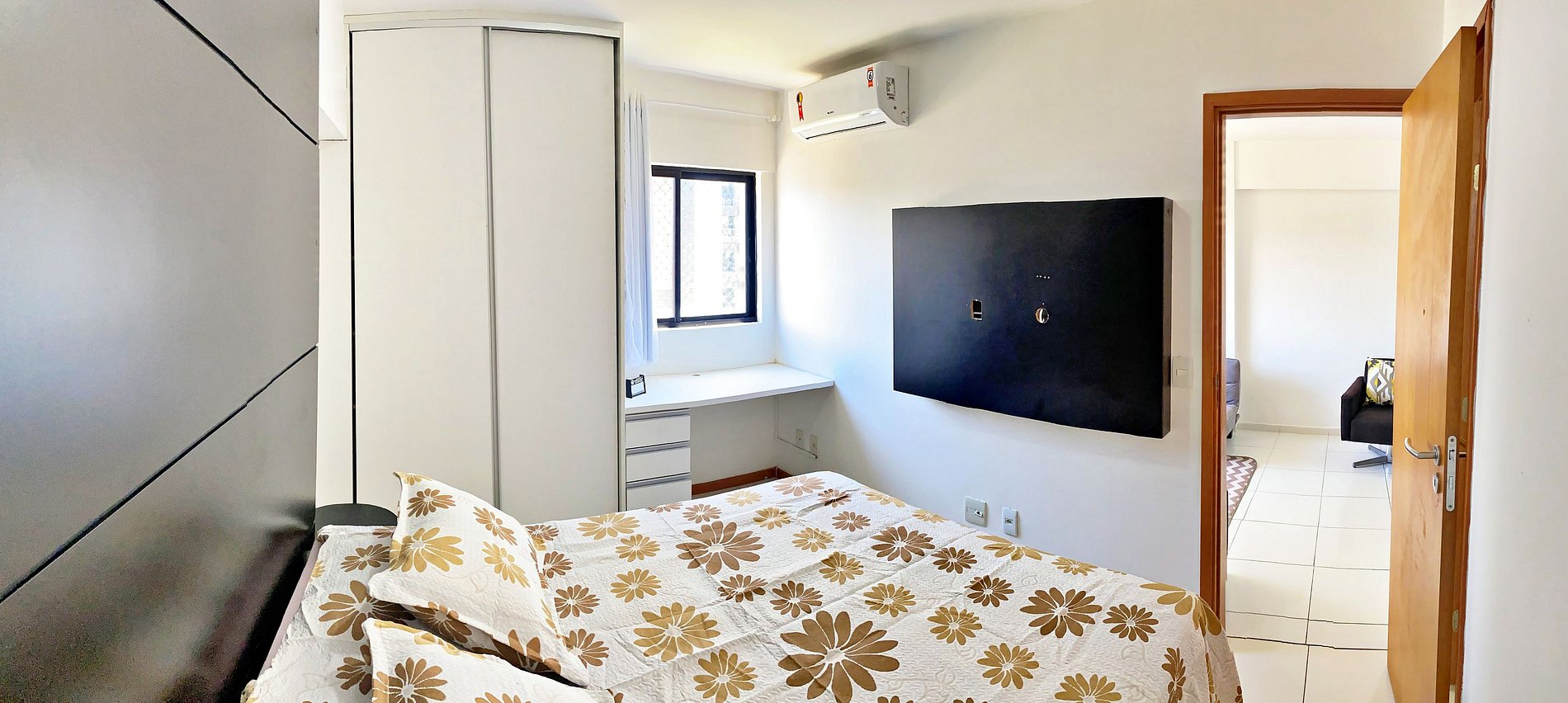 | QUARTO | com ar condicionado split, cama box de casal queen size, cortina blackout, roupas de cama e toalhas de banho.
