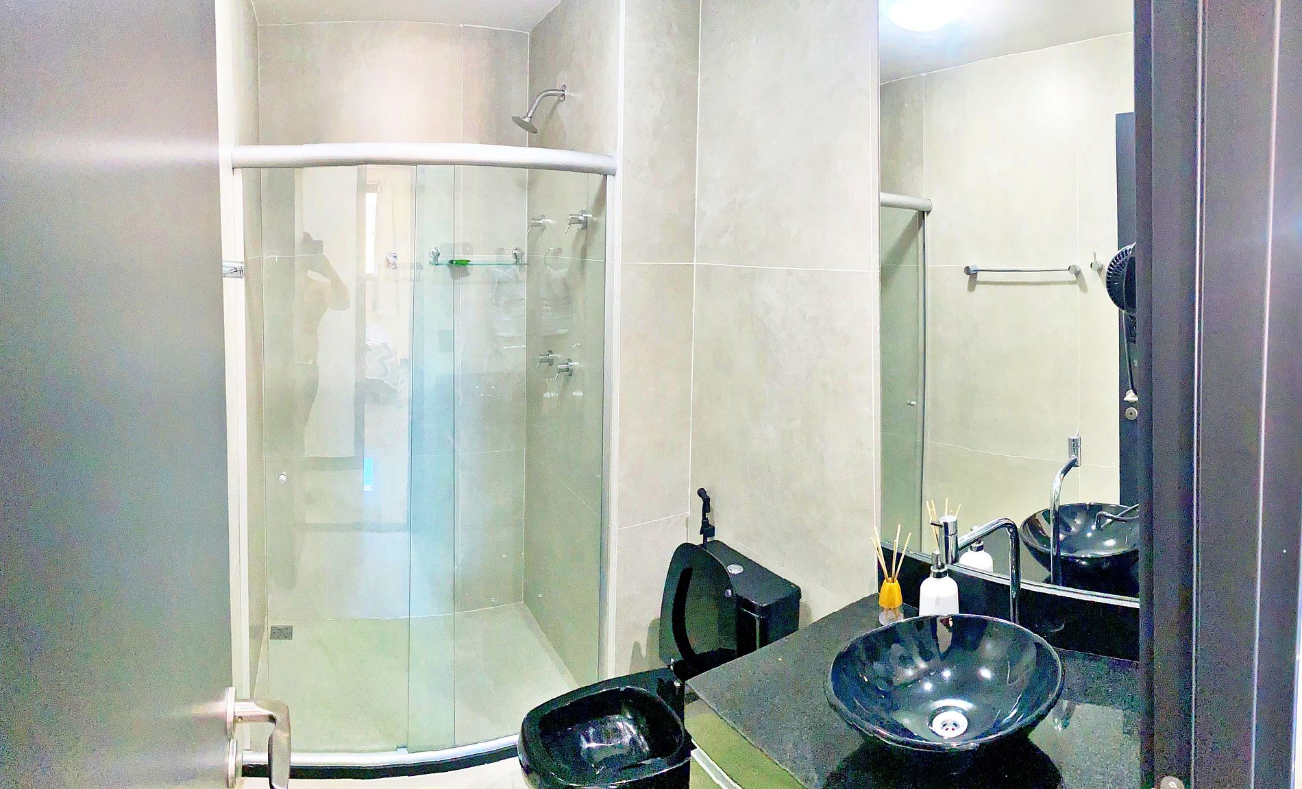 | BANHEIRO | com box de vidro incolor, armário e secador de cabelo.