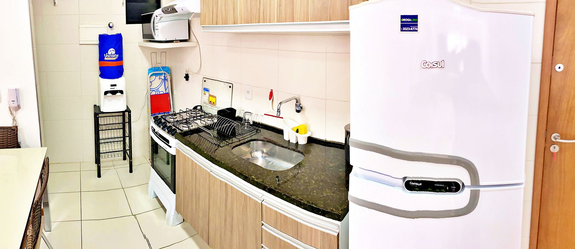 | COZINHA | com geladeira, fogão e micro-ondas, coifa, jogo de panelas e armários com utensílios para preparar refeições.