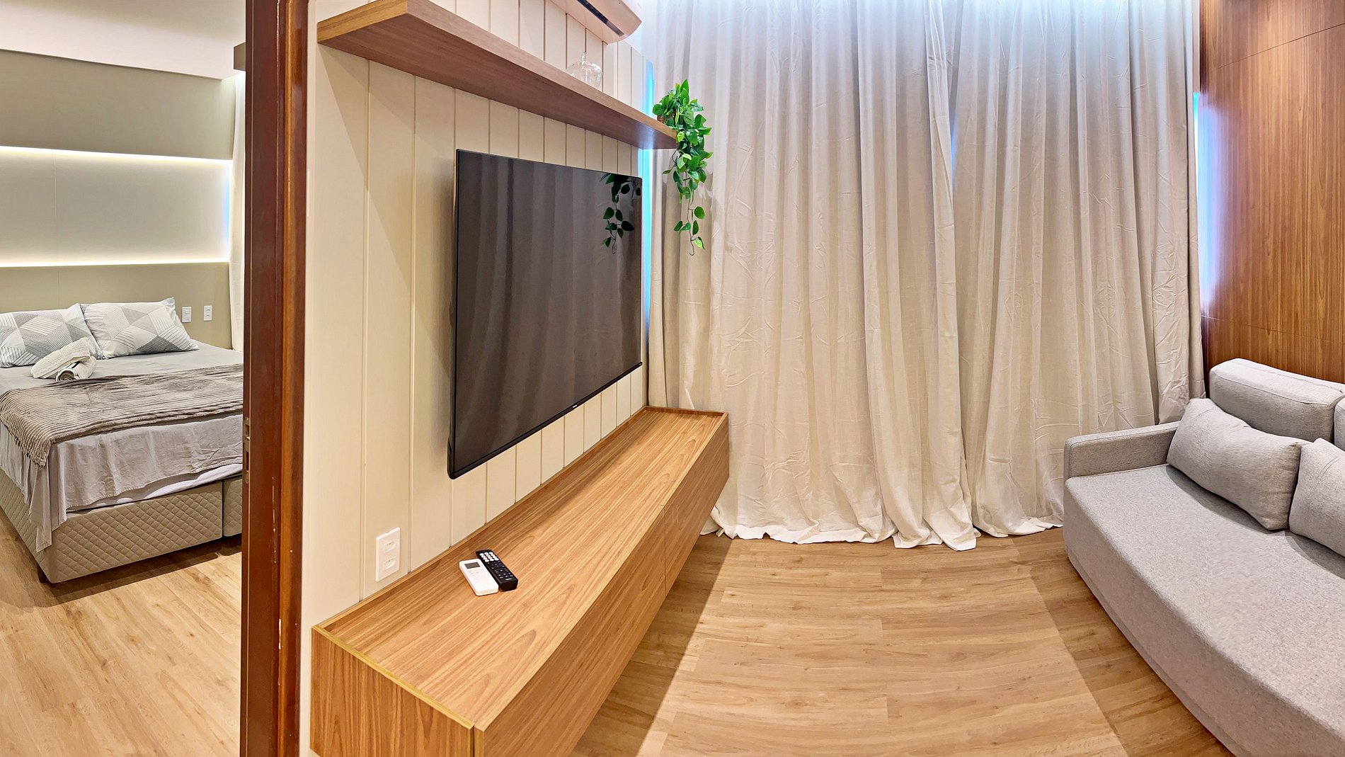 | QUARTO | com TV, ar condicionado split, cama box de casal queen size, cortina blackout, roupas de cama e toalhas de banho.